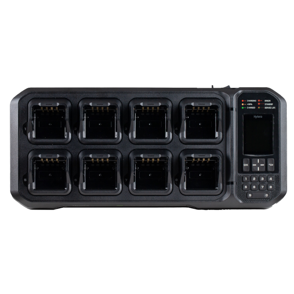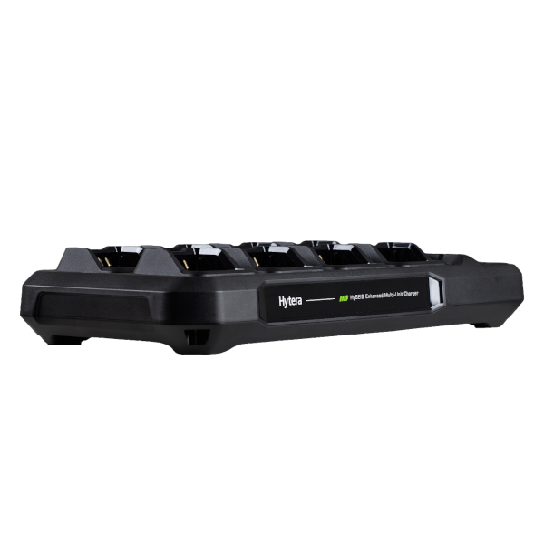 HySEIS-tehostettu moniyksikkölaturi, tulo 12 VDC / 15 A, lataus enintään 2 A per paikka, eurooppalaisen standardin mukaisella virtajohdolla, Hytera-logo (RoHS) (REACH)